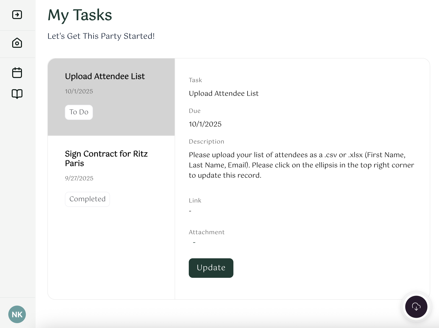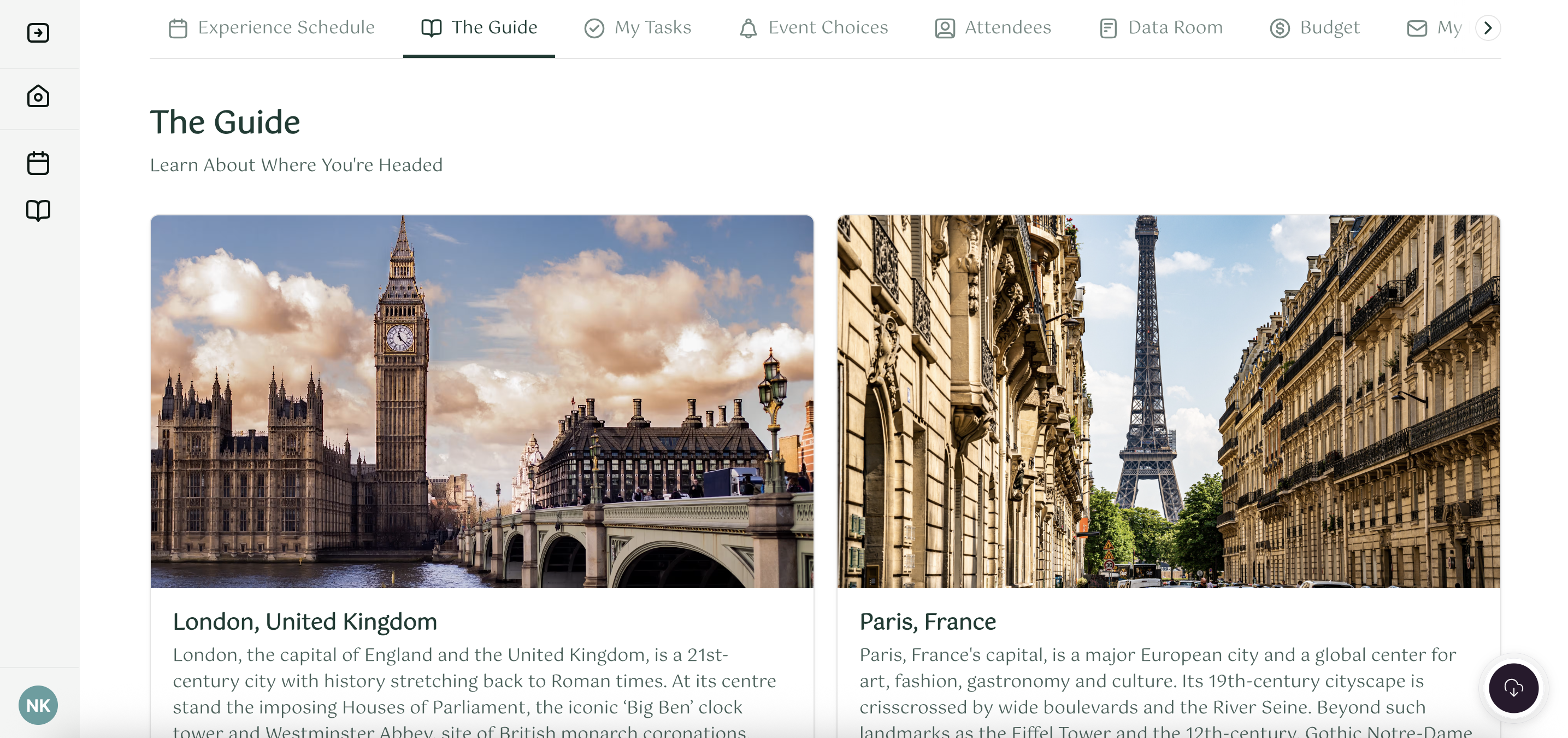 Your Itinerary, Attendees, Event Options, Files, and Tasks